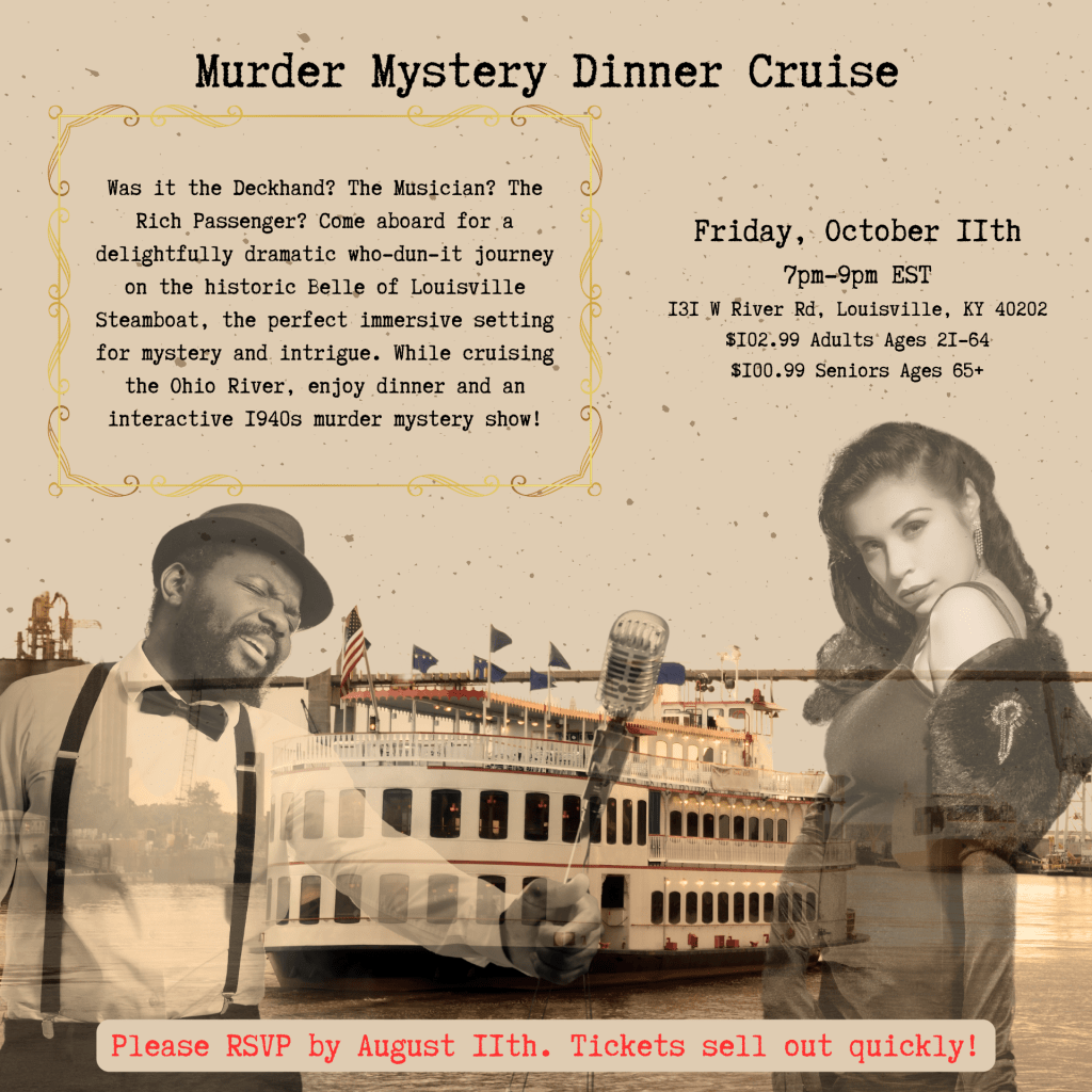 A memorable journey awaits you aboard the Belle of Louisville… the perfect immersive setting for mystery and intrigue! Aboard this two-hour excursion, guests will cruise the Ohio River and enjoy a delicious dinner and live murder mystery show “Murder and the Belle of Idlewild!” that can only be seen onboard the Belle. Can you figure out who the killer is?